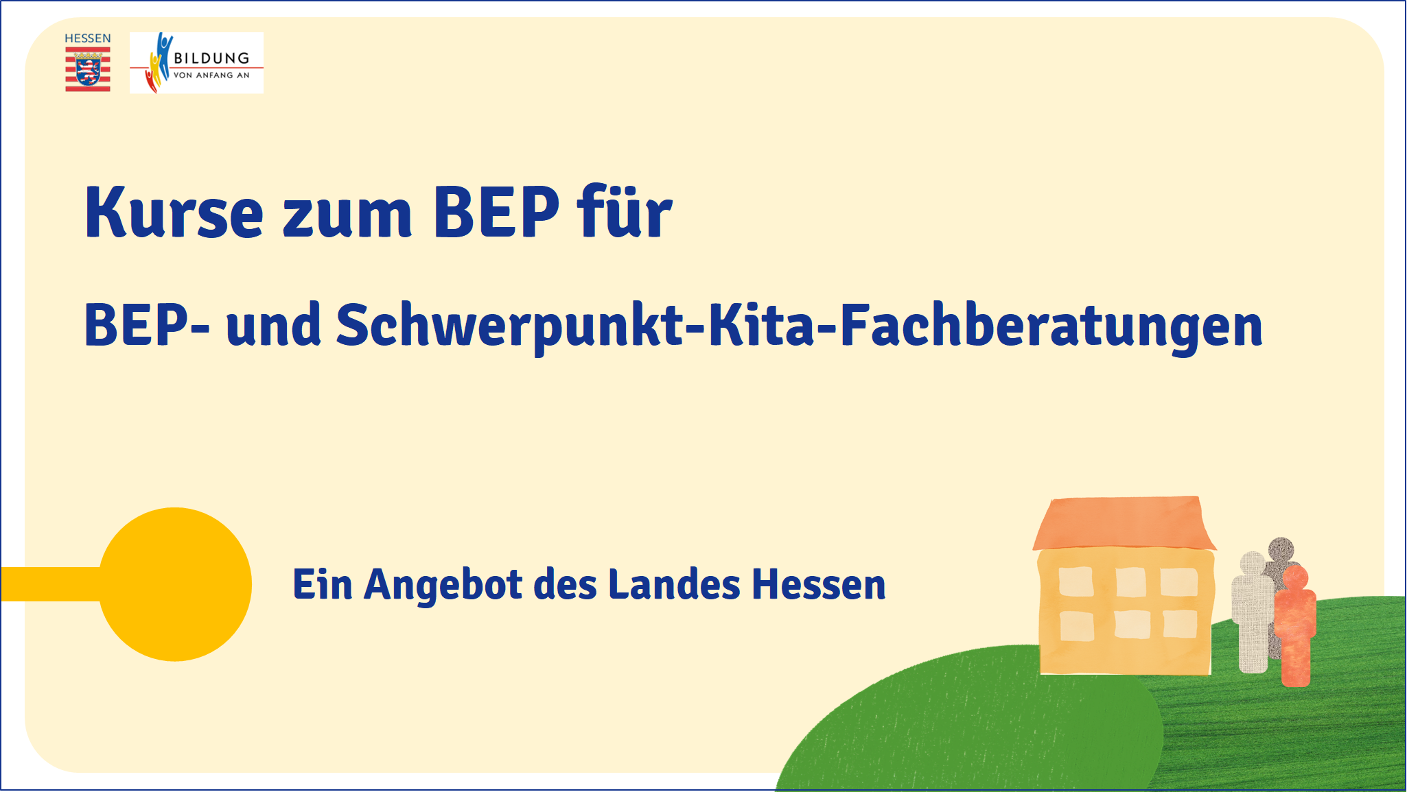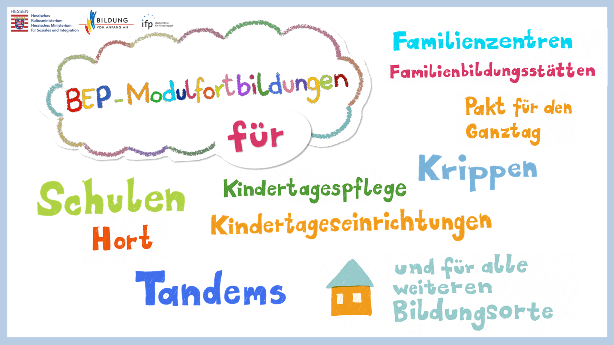 Der Bildungs- und Erziehungsplan für Kinder von 0 bis 10 Jahren in Hessen bindet alle Bildungsorte, die die Bildungsprozesse der Kinder begleiten, in der Weise ein, dass sie bei ihrer Bildungsarbeit die im Bildungs- und Erziehungsplan definierten Prinzipien berücksichtigen. In den Blick genommen werden dabei alle Bildungsorte, die Bildungsprozesse von Kindern moderieren und mitgestalten, d.h. das Elternhaus, vorschulische Kindertageseinrichtungen und Grundschulen ebenso wie Kindertagespflege, Kinderhorte, Einrichtungen der Familienbildung, Frühförder- und Erziehungsberatungsstellen, Bibliotheken, Vereine u.v.m. (Vgl. BEP, S. 34.) |